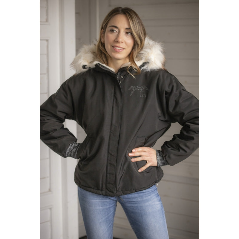 Le Blouson Aïko forme boule qui se resserre en bas et se ferme par un grand zip sur le devant caché par un rabat. Il est entièrement doublé de fausse fourrure "off white" et sa capuche est cerclée de fausse fourrure. Le bout des manches est gris foncé argenté et il possède deux poches zippées également cachées par un rabat. À l'arrière, une double bande noire brillante apporte une touche chic à ce blouson. Le logo Pénélope apparaît discrètement en strass sur le cœur.