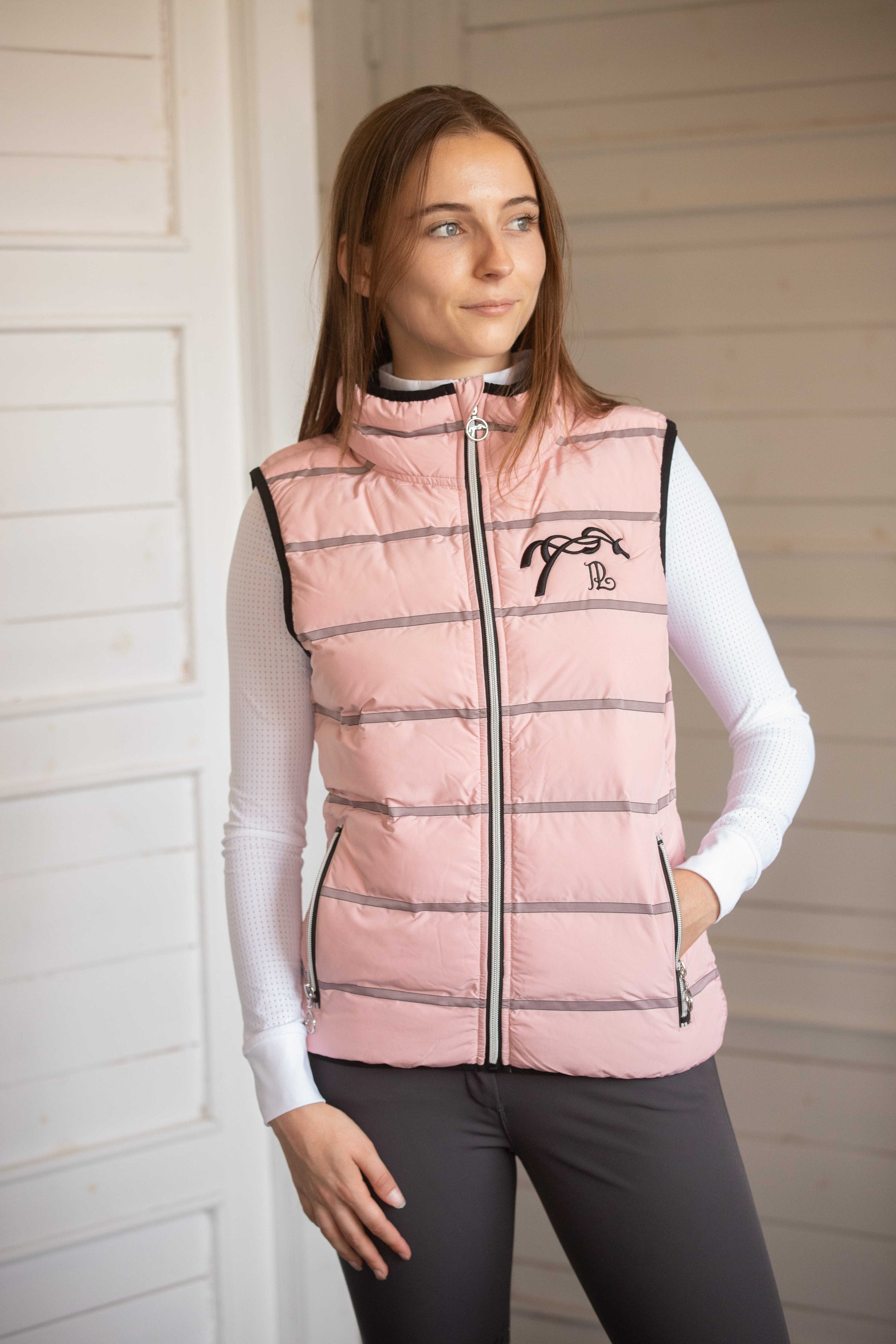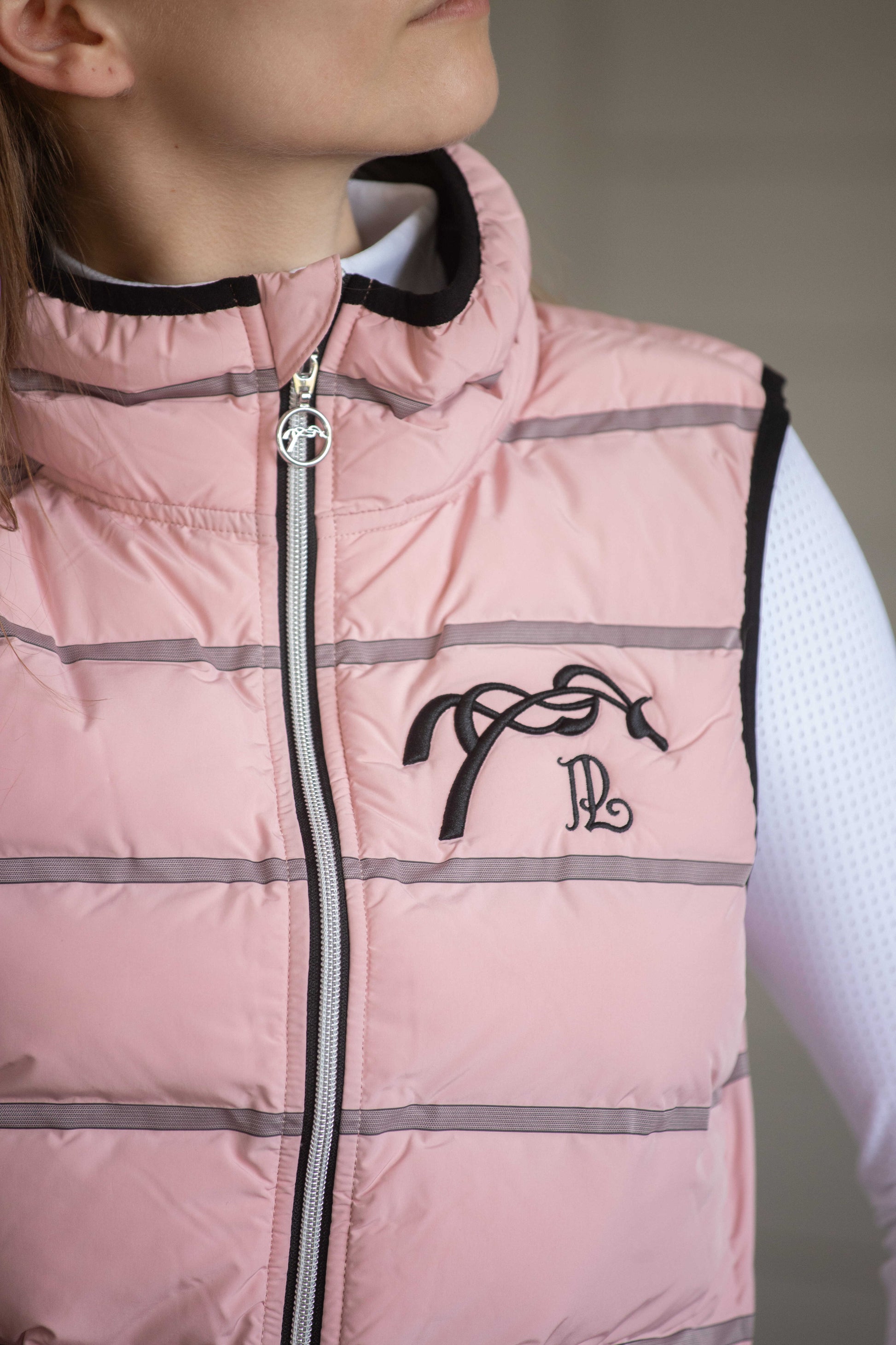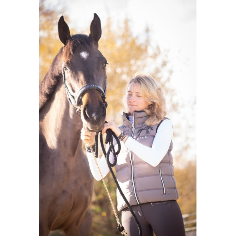 La doudoune sans manches Anouck des collections Pénélope est proposée dans un joli matelassage bien épais et gris. Elle est orné d'un galon foncé, en contraste en haut du col, tout en bas du vêtement et autour des emmanchures. Elle est idéale pour être libre de ses mouvements à cheval comme à pied. Elle garde aussi parfaitement la chaleur pendant la saison froide, par dessus un pull ou sous un blouson. Elle a deux poches zippées sur le devant et un col montant qui isole bien du froid. Le logo Pénélope est brodé en 3D sur le cœur.