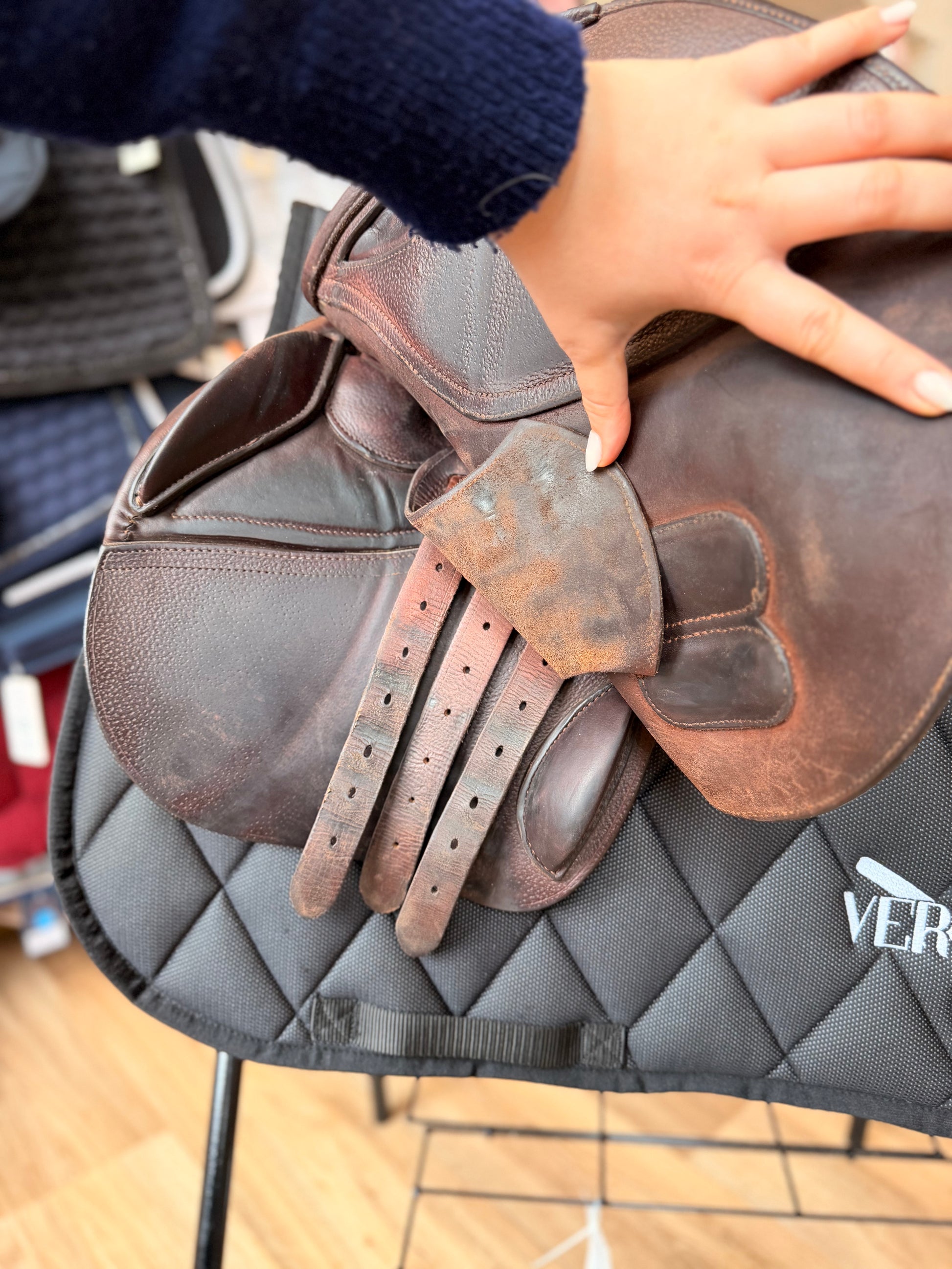 La selle est en très bon état général, avec uniquement la tache d’usure habituelle sur le siège, sans incidence sur l’esthétique ni sur l’utilisation.